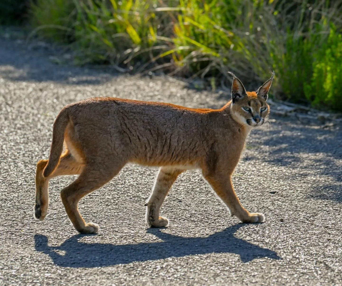 Hermes walks a “tightrope” near Kloof Nek in August 2020. He was our most-sighted caracal, recognizable by his pale colored ear tags.
