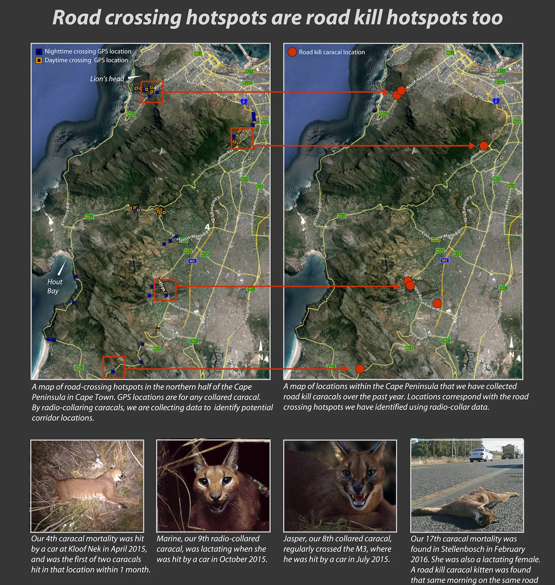 Using GPS points from collared cats, we are able to see when they cross roads. We've found that they frequently cross urban roads, which correlates with incidents of vehicular collisions. In one year alone, we collected 20 caracals that fell victim to roadkill in the Cape Peninsula - and these were only cats that had been reported. What this means is that the actual number of car-related fatalities is likely much higher than we realize.