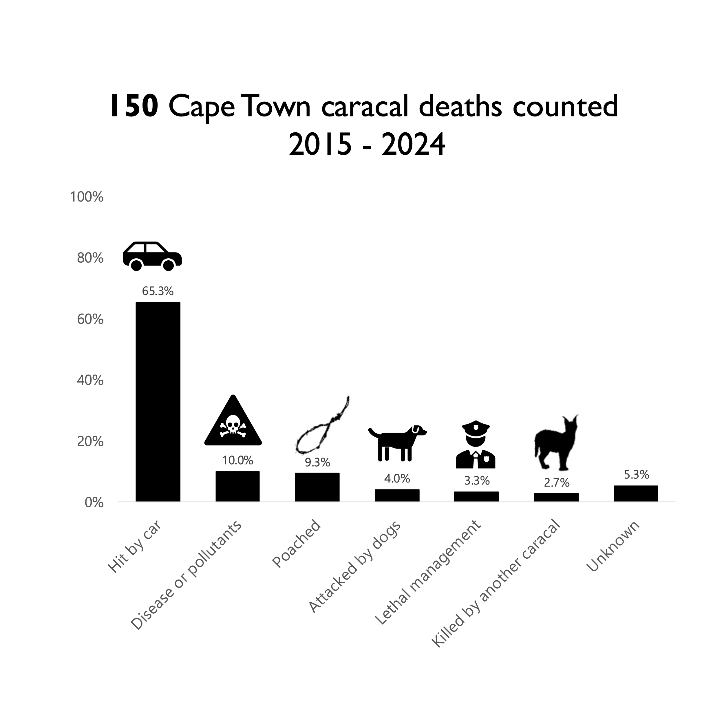 Navigating an urban environment presents a variety of unique challenges to wildlife, especially for animals with large home ranges like caracals. Here we present data we have collected after five years of recording and performing post-mortems on caracals that we found ourselves, or after they are reported to us by local community members. We collect the bodies of caracals that die in the Cape Peninsula, but also in and around other parts of Cape Town and it’s suburbs, including northern suburbs and as far north as West Coast National Park, and eastern suburbs and Stellenbosch. Undoubtedly our data are biased towards vehicle mortalities, as those are the easiest to see and find. There are likely many more deaths than we collect data on, particularly for caracals killed by disease, pesticides, poaching, and even caracals killing other caracals.